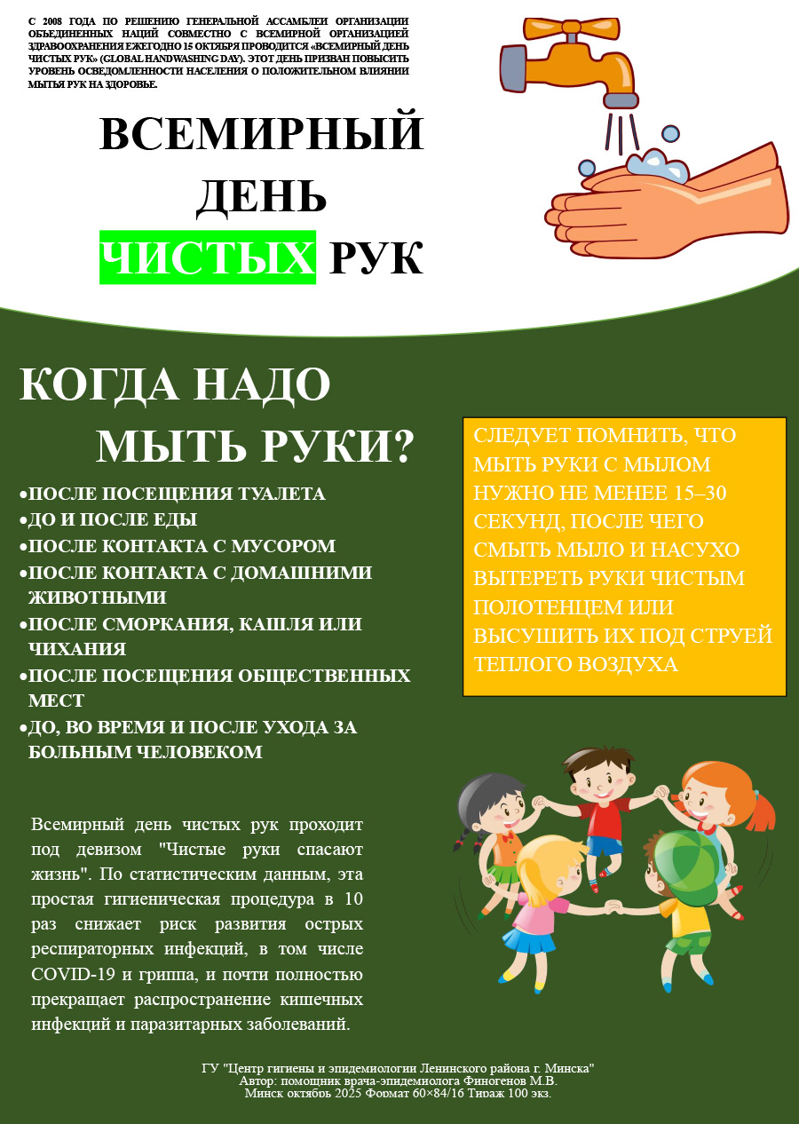 Ежегодно 15 октября проводится «Всемирный день чистых рук». Главная цель этого дня - привить внимание к правильному мытью рук, ведь это самый эффективный профилактический способ защитить себя от заболеваний. В последние годы в мире регистрируются вспышки новых форм гриппа, вирусных диарей, вызванных энтеровирусами, норовирусами, ротавирусами, коронавирусной инфекции, поэтому важность соблюдения личной гигиены, в частности мытья рук, возрастает.